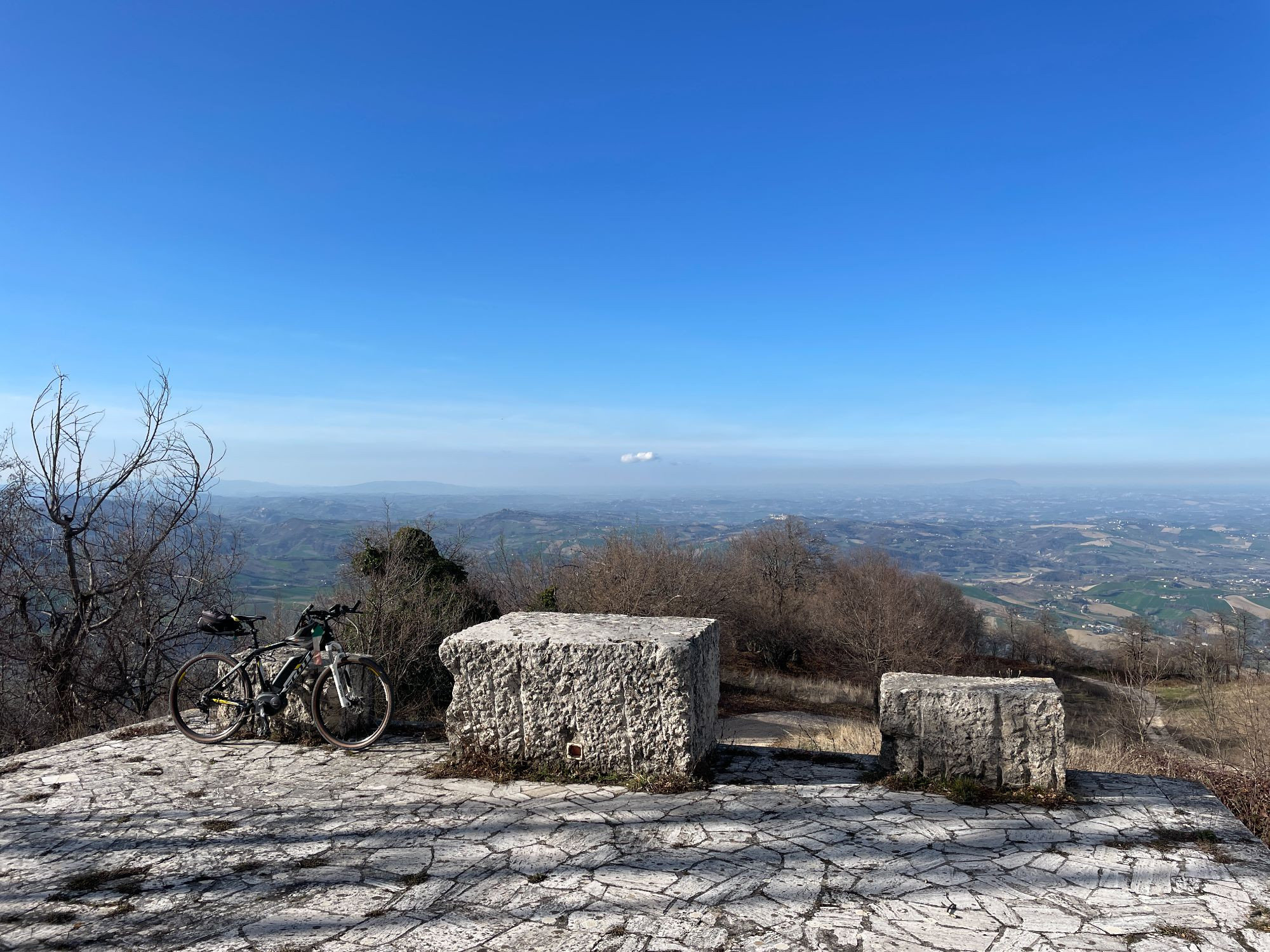 L’ultimo tornante svela un paesaggio insolito e un po’ apocalittico, punteggiato da una selva di antenne e ripetitori. Vale comunque la pena proseguire fino alla croce, da cui si apre una vista mozzafiato sulla piana di Ascoli: sotto di noi i dirupi del monte e i bianchi calanchi, e in lontananza, la città di Ascoli. Iniziamo la discesa lungo il tratto più impegnativo del percorso, uno sterrato con fondo non sempre regolare e con alcuni tratti ripidi. Dopo qualche chilometro, ci immettiamo su uno sterrato più scorrevole che prendiamo svoltando a sinistra. Dopo un breve tratto in salita torniamo nuovamente a scendere e, al primo bivio asfaltato, prendiamo nuovamente a sinistra per raggiungere la borgata di Capradosso e proseguire tranquillamente sino a Rotella.