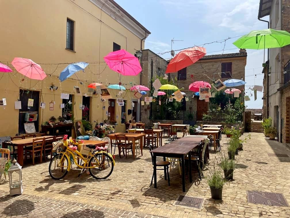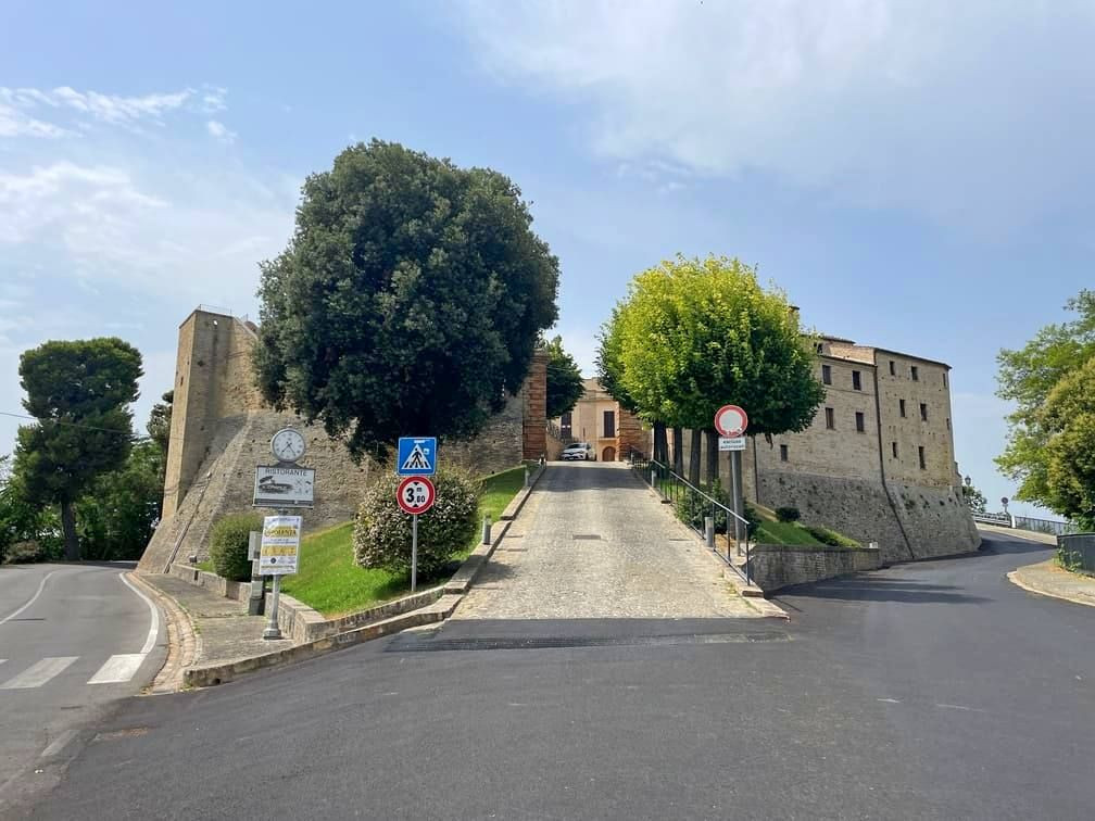 Proseguiamo a pedalare per giungere al nostro sesto paese, Monte Vidon Combatte, un piccolo borgo-castello con ingresso a doppia porta, ingentilito da loggiati ed archi.